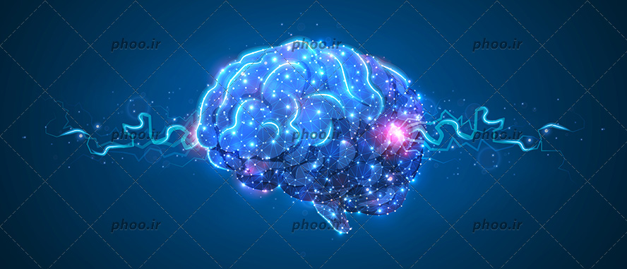 عکس گرافیکی از مغز انسان با چشمک و جرقه های آبی با نورهای آبی در دو طرف آن در زمینه آبی